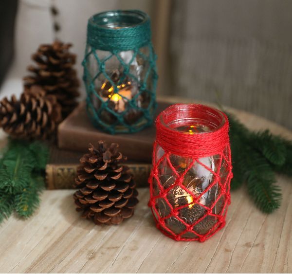3. Christmas jute mason jarPlace finished jars onto a table as part of a centerpiece or fill them with small ornaments, twinkle lights or pine cones and line them up on a mantel. You don’t have to know how to crochet or knit for this simple jute DIY project.