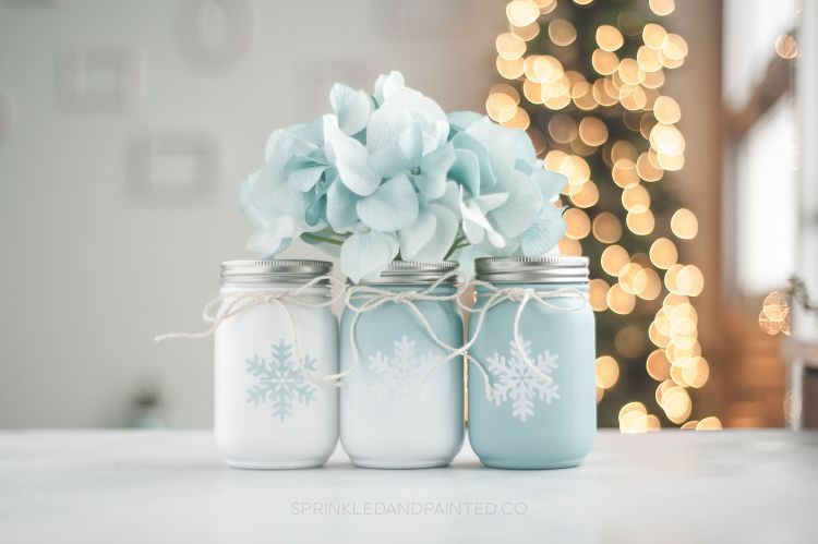 7. Aqua snowflake mason jars (h/t Ka Styles)If you are looking for a floral, peaceful design, this DIY is for you! We are obsessed with this mason jar trio! Aside from the mason jar, you’ll need acrylic paint and a snowflake stencil