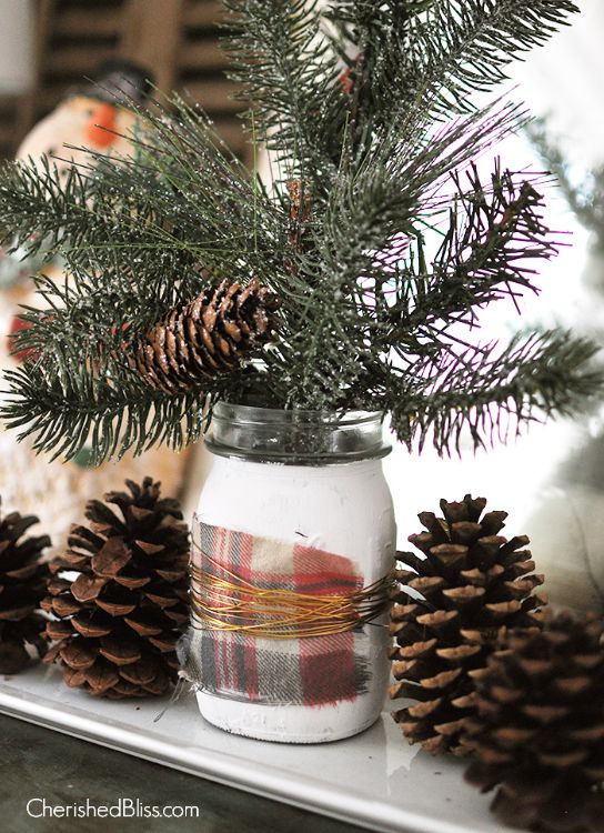5. Metallic-wire wrapped mason jars (h/t Cherished Bliss)This mason jar craft adds a touch of plaid and metallic wires. Pair with rustic pine cones and some Christmas floral stems. You’ll have a little mini Christmas tree that you can put on your dining table or fireplace mantel.