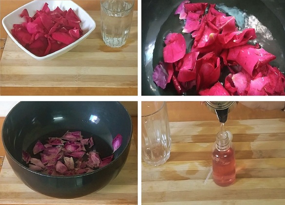 - Heat the water on a low flame and cover the pot with a lid. Allow the water to steam until the petals have lost their color and the water has taken on the color of rose petals.