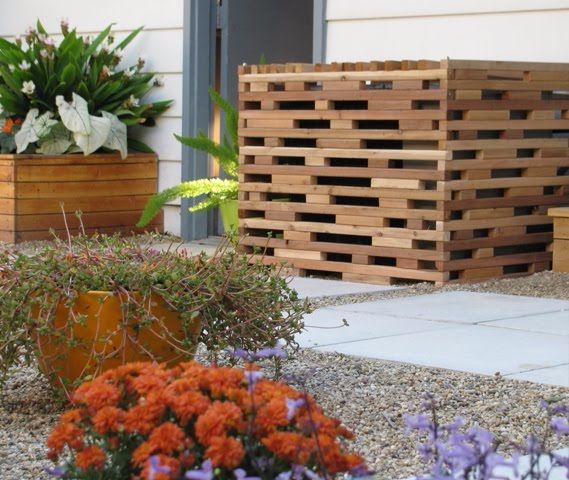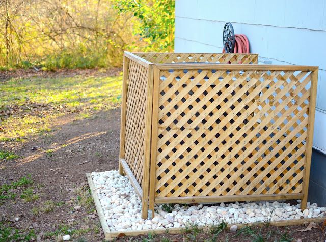 Lattice panels provide the screening to hide The Feminist Housewife’s air compressor. She used white landscaping rocks to help anchor the panels and discourage plant growth, with a small frame to keep the rocks from scattering.