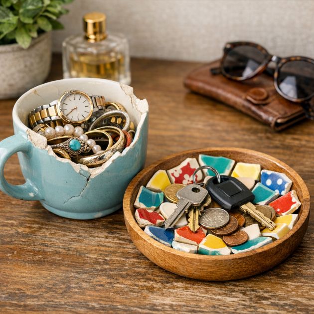 Create unique jewelry holders or catchall trays by repurposing your chipped mugs. For jewelry storage, use the mug to hold bracelets, watches, or rings, keeping them organized and easily accessible. The depth of the mug is perfect for preventing smaller items from getting lost.For a catchall tray, consider breaking the mug into smaller pieces and arranging them in a shallow dish or tray. The colorful shards add a whimsical touch, perfect for holding keys, coins, or other small items. This creative repurpose not only enhances your decor but also ensures your essentials are always within reach.9. Build a Mosaic Using Broken or Cracked Pieces