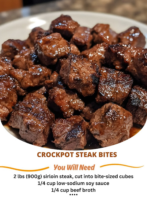 Why You’ll Love This RecipeTender & Flavorful : Slow cooking ensures the steak is incredibly tender and infused with bold flavors.Hands-Off Cooking : Just toss everything into the crockpot and let it do the work—perfect for multitasking or relaxing.Versatile : Serve as a main dish, appetizer, or even a party snack—it’s adaptable to any occasion.Budget-Friendly : Use affordable cuts of beef like sirloin or stew meat, and let the slow cooker transform them into something amazing.Meal Prep Friendly : Great for leftovers and reheats beautifully for lunches or dinners throughout the week.Ingredients You’ll NeedServes 4–6For the Steak Bites:2 lbs beef sirloin, stew meat, or chuck roast , cut into bite-sized cubes2 tbsp olive oil1 medium onion , sliced3 garlic cloves , minced1 cup beef broth (low-sodium preferred)1/2 cup Worcestershire sauce1/4 cup soy sauce2 tbsp brown sugar (optional, for a touch of sweetness)1 tsp smoked paprika1 tsp dried thymeSalt and pepper , to taste