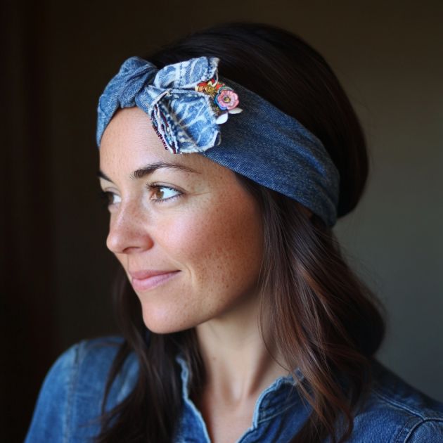 A denim headband is a stylish accessory that can be made in minutes. Cut a strip of denim long enough to wrap around your head, and sew the ends together. For added flair, twist the strip before sewing or add embellishments like beads or fabric flowers. This headband is a great way to use up small scraps and add a touch of denim to your outfit.