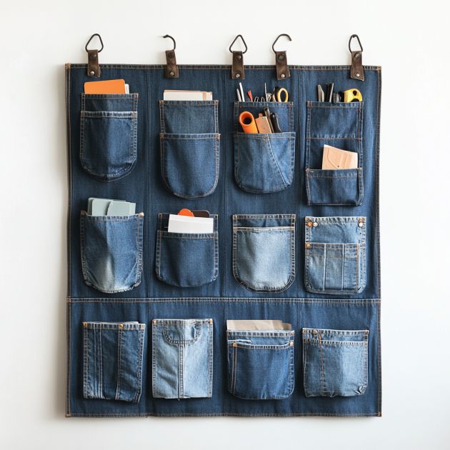 Keep your space tidy with a denim wall organizer. Cut several pockets from the jeans and sew them onto a large piece of denim or canvas. Attach loops or grommets at the top for hanging. This organizer is perfect for storing mail, tools, or craft supplies, and the pockets can be arranged in any configuration to suit your needs.