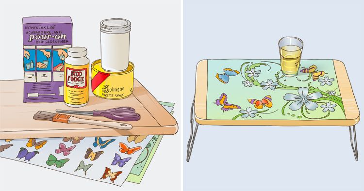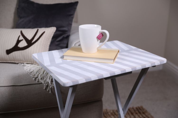 Take your TV trays up a notch by covering them in pretty strips of paper. The fun part of this project is that you can use scrap paper you have left from other crafts. Pick a medium-weight paper (if it’s too thick, it can curl and bubble). Attach your design to the table with Mod Podge.