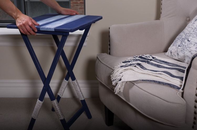 Add a pop of colorDon’t be afraid to give an old tray new life by painting it a new, bold color. A bright color can really make the piece stand out in a room. Style with some greenery and empty glass bottles to help set the mood. Afterwards, you won’t even recognize the old item anymore!Coastal makeoverIf you want to completely transform the table to create a cool nightstand, follow the directions in this tutorial.