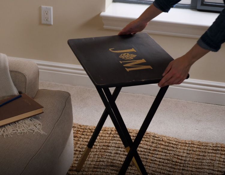 Monogrammed trayIf you’re looking for something sleek and upscale, try painting an old TV tray dark and adding a monogram to match your surname. This classy overhaul makes even cheap tables look super fancy.