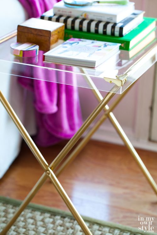 Lucite look’ tv trayGive your tv tray a more modern spin by upgrading the top to clear acrylic. Not only is this DIY version very affordable, it comes out looking truly swoon-worthy. The “real” version sells for $150 whereas the DIY version is just a fraction of the cost. Get the full tutorial at In My Own Style.