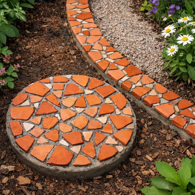 Broken terra cotta saucers can be easily transformed into charming garden markers. Use a piece of chalk or a paint pen to write the names of herbs, flowers, or vegetables on the larger shards. These pieces can be placed directly into the soil where they are both decorative and functional, helping you to keep track of your plantings.For a more durable option, consider using an outdoor acrylic paint to label your garden markers. Once the paint is dry, apply a clear sealant to protect the writing from the elements. Pieces that are roughly 3 to 5 inches in length work best for this purpose, as they are large enough to be visible but small enough to not overwhelm the plants.2. Create Mosaic Stepping Stones and Path Edging