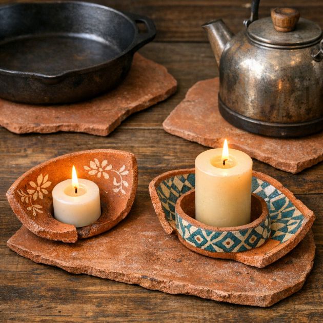 Transform broken terra cotta saucers into practical soap dishes or sink-side catchalls. Select larger, concave pieces that can hold soap bars or small items like rings and earrings.Sand down any sharp edges and, if desired, paint the inside of the dish with waterproof acrylic paint. Apply a clear sealant to ensure the dish is water-resistant. These upcycled pieces bring a touch of natural elegance to your bathroom or kitchen.8. Fashion Rustic Candle Holders and Heat Shields