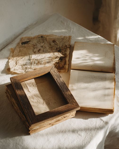 Carefully remove pages from an old book, selecting those with interesting text or images.