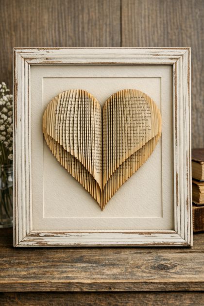 This folded book page heart art piece is versatile and can complement various interior design styles. For a rustic or vintage look, pair it with wooden frames and place it against textured walls, perhaps near a bookshelf or reading nook. If your home leans towards modern design, consider using a sleek, minimalist frame and displaying it on a gallery wall alongside simple, monochromatic art pieces. The neutral tones of the book pages allow it to blend seamlessly with both bold and muted color palettes.