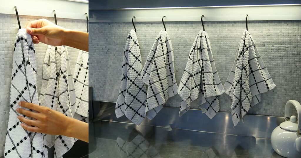 Use shower rings to hang dish towelsIt’s unlikely that a day goes by when a dish towel isn’t used in the kitchen. These simple swatches of fabric make themselves useful when it comes to cleaning up messes, drying hands and giving a countertop a quick shine. While dish towels are extremely useful, they tend to hold moisture which can lead to bacteria growth and unpleasant odors over time. Help dish towels stay dry and fresh for longer by hanging them on S-hook shower rings in the kitchen. Loop the ring over a tension bar, and hang the dish towel from the other end. This strategy makes it easy to find a dish towel when it’s needed, helps them dry quickly and keeps them up off the counter.