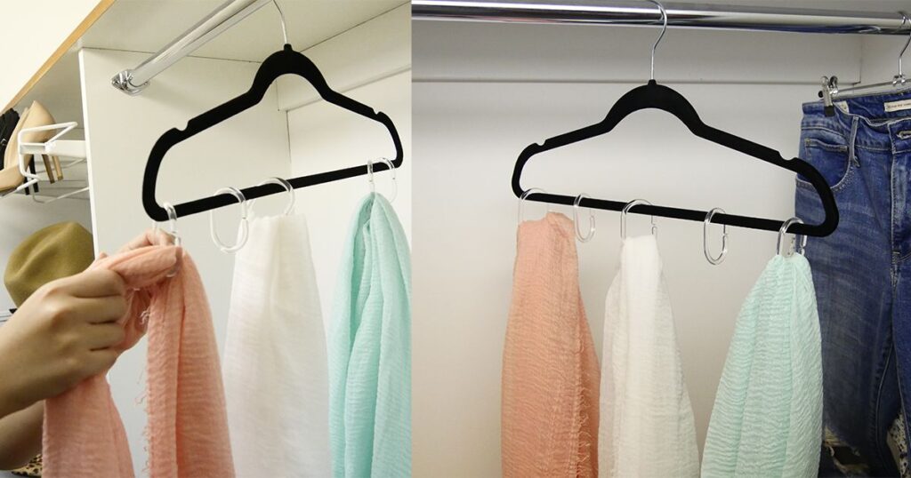 Hang scarves up with shower ringsWhen the fall season rolls around, or it is time to add an elegant accessory to an outfit, a colorful scarf can be just what you needed. While a bundle of scarves means plenty of options, finding just the right one at the back of the closet can be far less exciting. Instead of letting scarves find their way into closet corners and onto floors, organize them by hanging them on shower rings. The plastic version that clips through shower curtains can also be easily clipped onto the bottom bar of a hanger. Once in place, slip a scarf through each individual shower ring and leave the stress of searching far behind.