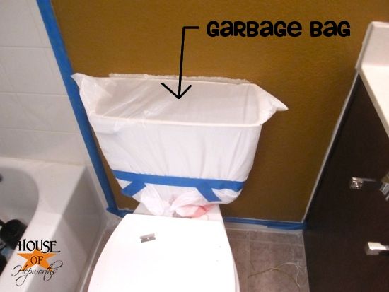 5. Keep paint off the toilet using a garbage bag (h/t House of Hepworths)Painting a bathroom is a tricky project. There are so many small spaces to get around. You simply can’t afford to remove your toilet to paint behind it, but often the gap between the toilet and the wall is visible. How do you paint it without painting the toilet?Cover the toilet with an inexpensive trash bag. It slides right over the tank. Painter’s tape secures the bag and keeps the plastic off the wall. After the paint has dried, remove the bag and throw it away.