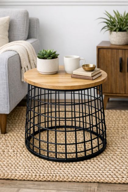 Materials1 wire basket (approximately 18 inches in diameter and 24 inches in height)1 round tabletop (wood, glass, or acrylic, approximately 20 inches in diameter)Spray paint (optional, color of choice)Sandpaper (for wooden top, if needed)Epoxy glue or strong adhesiveProtective gloves and mask (for painting)Measuring tapeDirectionsBegin by cleaning the wire basket thoroughly to remove any dust or debris.If desired, spray paint the wire basket in a well-ventilated area. Use even strokes and allow it to dry completely.Take the round tabletop and sand the edges if it’s made of wood to ensure a smooth finish.Measure the diameter of the basket’s top to ensure the tabletop will fit securely.Apply epoxy glue or strong adhesive to the rim of the basket.Carefully place the tabletop onto the glued rim, pressing down gently to ensure it adheres well. Allow it to set according to the adhesive’s instructions.Once everything is dry and secure, flip the basket, so the base is now the top, and the tabletop is securely in place.Position the new side table in your desired location and style with books, a lamp, or decorative items.