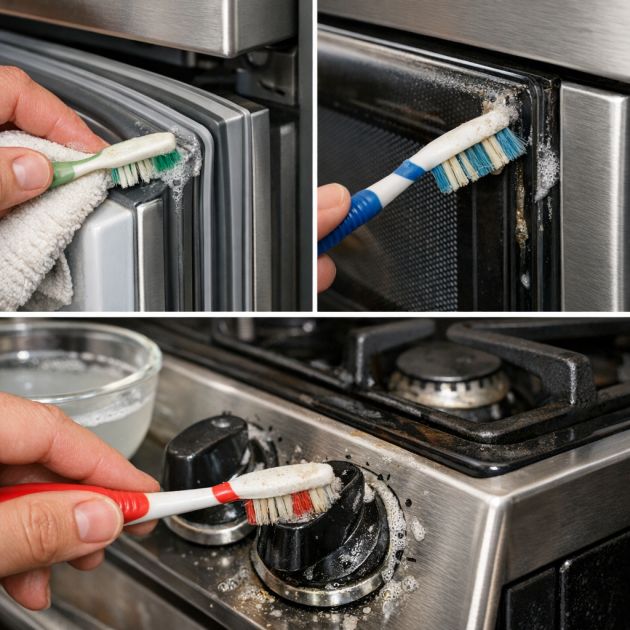 Kitchen appliances often have small nooks and crannies where food particles and grease can accumulate. An old toothbrush is perfect for cleaning these areas. Use a solution of warm water and vinegar or a mild kitchen cleaner. Scrub the seals of your refrigerator, the edges of your microwave door, and around the knobs and handles of your stove. The bristles can reach into tight spaces without scratching surfaces, making your appliances look and smell clean.