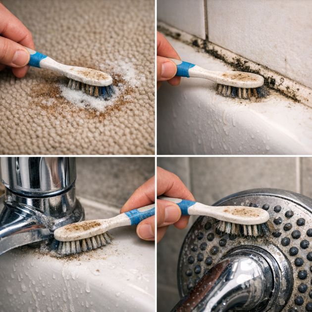 An old toothbrush is a versatile addition to any cleaning kit. Use it to tackle tough stains on fabrics or carpets by applying a stain remover and gently scrubbing the area. For bathroom and kitchen seals, such as those around sinks and tubs, a toothbrush can help remove mold and mildew. Additionally, the toothbrush is perfect for cleaning fixtures, such as faucets and shower heads, where its small size allows it to reach and clean effectively.