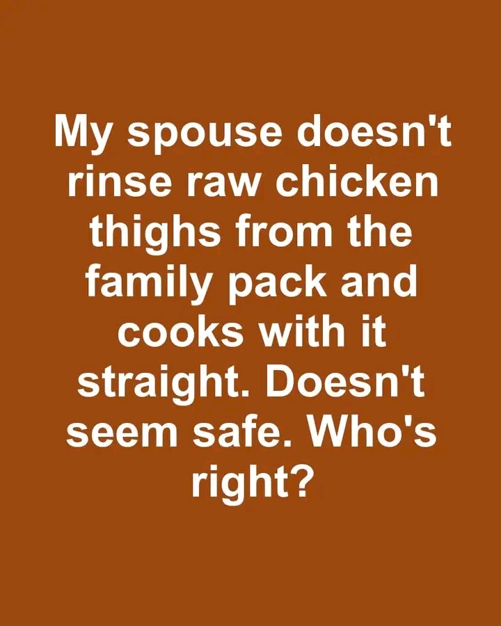 My spouse doesn’t rinse raw chicken thighs from the family pack and cooks with it straight. Doesn’t seem safe. Who’s right?