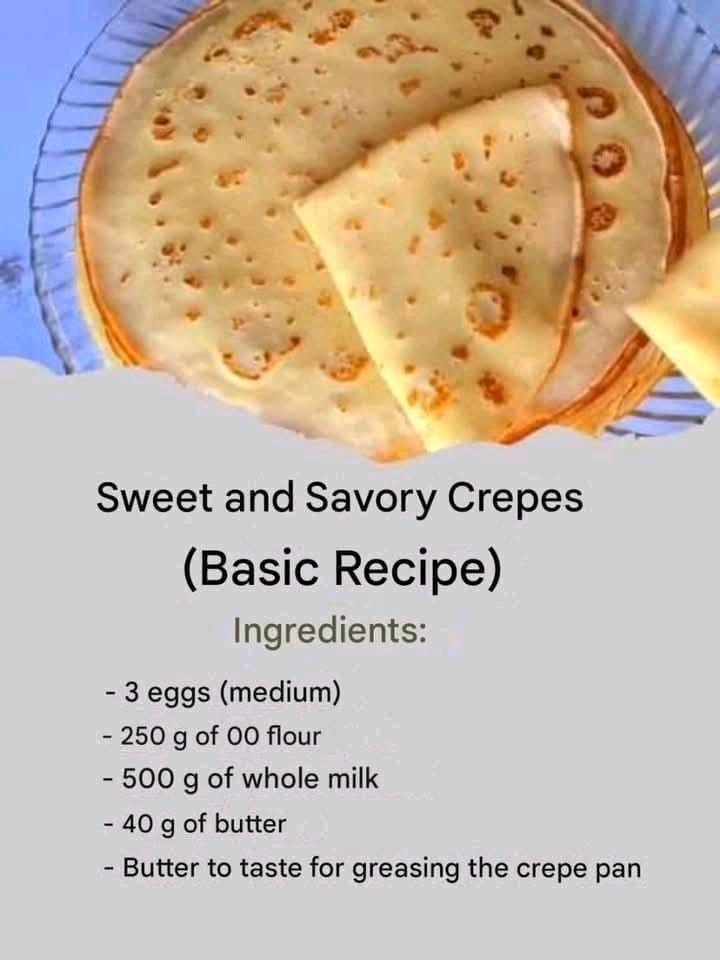 Crepes are a versatile delight that can be enjoyed both sweet and savory. This basic recipe will help you make perfect crepes, ready to be filled however you like! Ingredients (for about 14 crepes, 18 cm / 7-inch diameter):