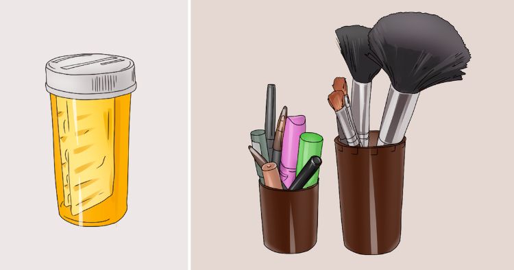 Paint the pill bottles a pretty color and fill it up with makeup brushes, Q-tips, whatever else will fit. You can also make yours magnetic and stick it to a board to keep organized.