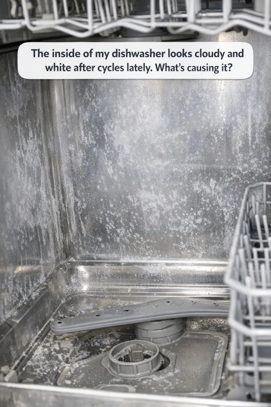 The inside of my dishwasher looks cloudy and white after cycles lately. What’s causing it?