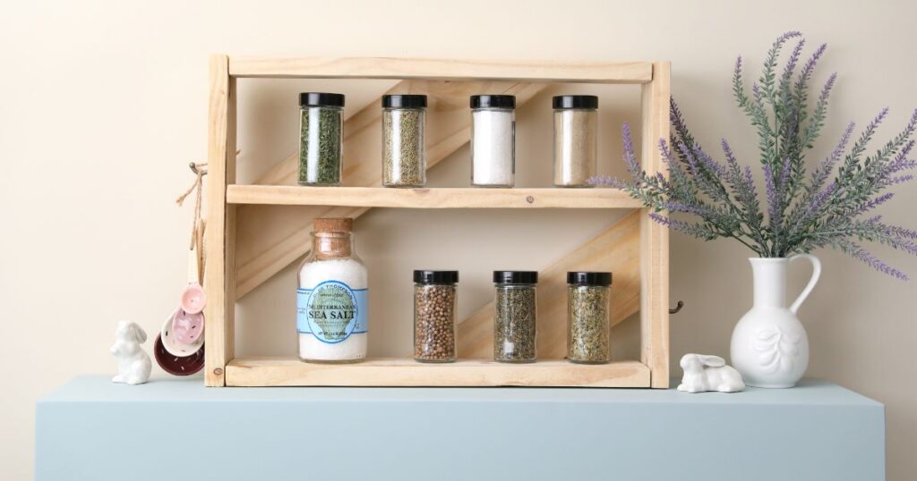 Every ardent home chef loves to have plenty of spices on hand, but no one likes having to rummage around cluttered cabinets to find them. Bring joy back to cooking with this easy spice rack made from pallet boards. A few hooks on the side can hold a set of teaspoons or measuring cups. When you’ve stocked it, you’ll be able to grab and dash your favorite flavors quickly.