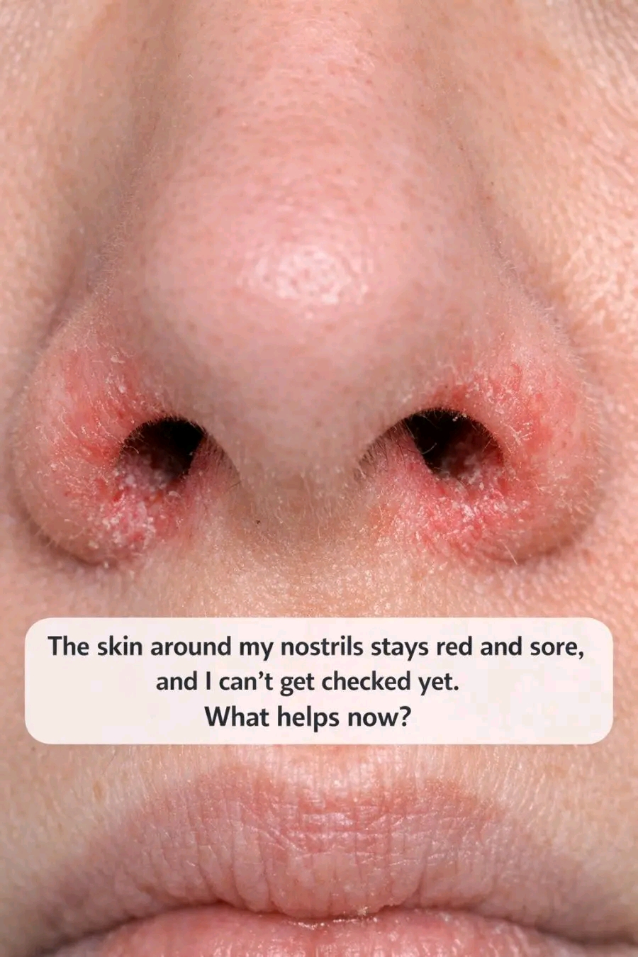 The skin around my nostrils stays red and sore, and I can’t get checked yet. What helps now?