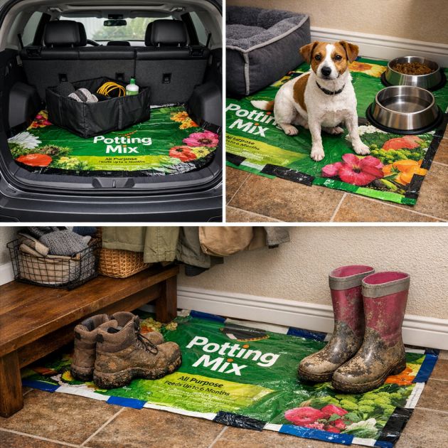 Use empty potting soil bags to line the trunk of your car, pet areas, or mudrooms. The bags’ waterproof nature makes them perfect for protecting surfaces from dirt, moisture, and spills.Cut the bags to fit the desired area, and secure them in place with tape or clips. In pet areas, they can act as a barrier against accidents, while in mudrooms, they catch dirt and grime from shoes. This practical use helps keep spaces clean and reduces cleanup time.