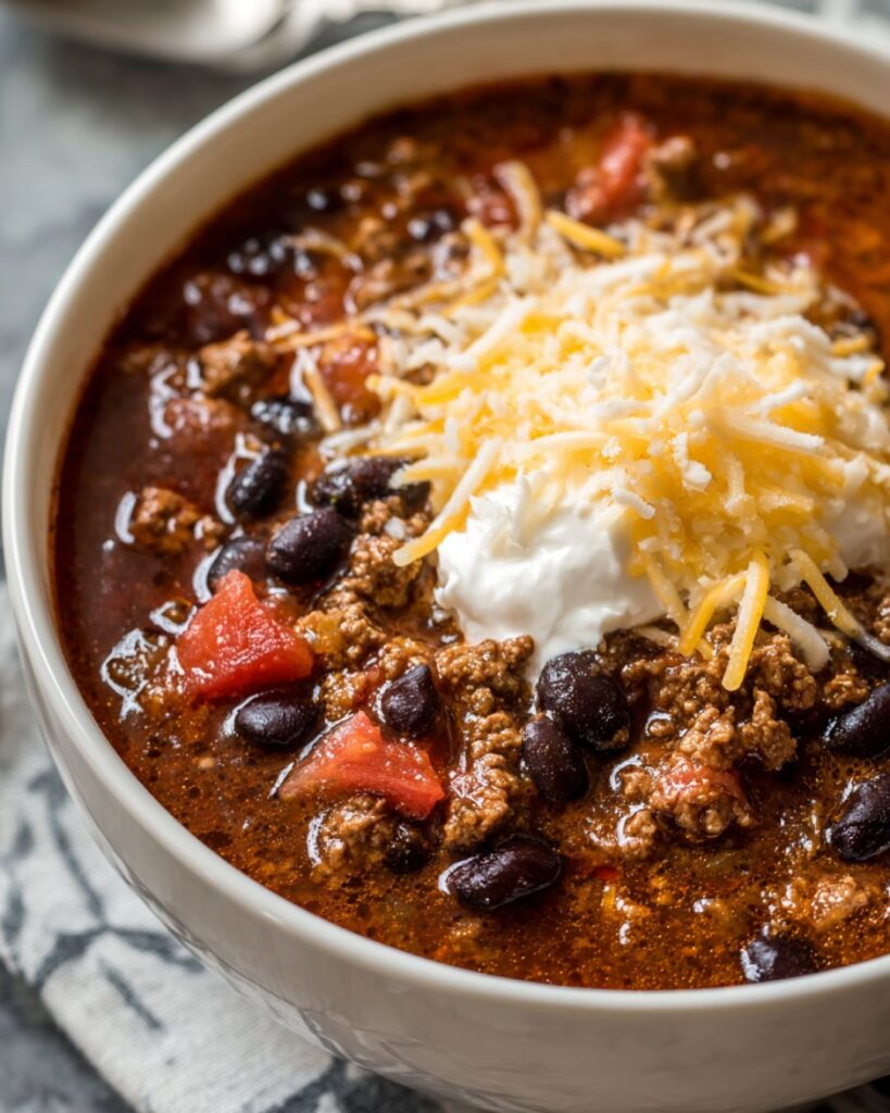 Ingredients1 pound ground beef1 packet (1 ounce) taco seasoning mix1 can (15 ounces) chili beans in sauce, undrained1 can (15 ounces) black beans, drained and rinsed1 can (15 ounces) corn, drained (or 1 1/2 cups frozen corn)1 can (14.5 ounces) diced tomatoes with green chilies, undrainedDirectionsIn a skillet over medium heat, cook the ground beef, breaking it up with a spoon, until it is no longer pink. Drain off any excess grease.Sprinkle the taco seasoning over the cooked beef in the skillet and stir well to coat the meat evenly.Transfer the seasoned beef to the slow cooker.Add the chili beans with their sauce, the drained and rinsed black beans, the drained corn, and the diced tomatoes with green chilies (including their juices) to the slow cooker.Stir everything together gently until well combined.Cover and cook on LOW for 6–8 hours or on HIGH for 3–4 hours, until the soup is hot and the flavors have blended.Taste and adjust seasoning if needed. Ladle into bowls and serve hot, with your favorite toppings such as shredded cheese, sour cream, or crushed tortilla chips, if desired.Variations & TipsIf you grew up in a house where the soup pot was a way to clean out the pantry, this recipe will feel familiar and forgiving. You can swap the black beans for kidney or pinto beans, or use all one kind if that’s what you have on hand. If your family prefers a milder soup, choose plain diced tomatoes instead of tomatoes with green chilies, or use only half the taco seasoning packet and add more at the end if needed. For a heartier, almost chili-like bowl, stir in 1–2 cups of beef broth or tomato juice to loosen it up and stretch the servings. You can also add a handful of chopped onion or bell pepper when you brown the beef for extra flavor, though that will nudge you over six ingredients. Those who don’t eat beef can easily substitute ground turkey or even cooked shredded chicken. Leftovers keep well in the refrigerator for several days and freeze nicely—my tip is to cool the soup completely, ladle it into freezer containers in meal-size portions, and label it with the date. On a busy winter evening, pulling out a container of this taco soup feels a bit like finding money in an old coat pocket.