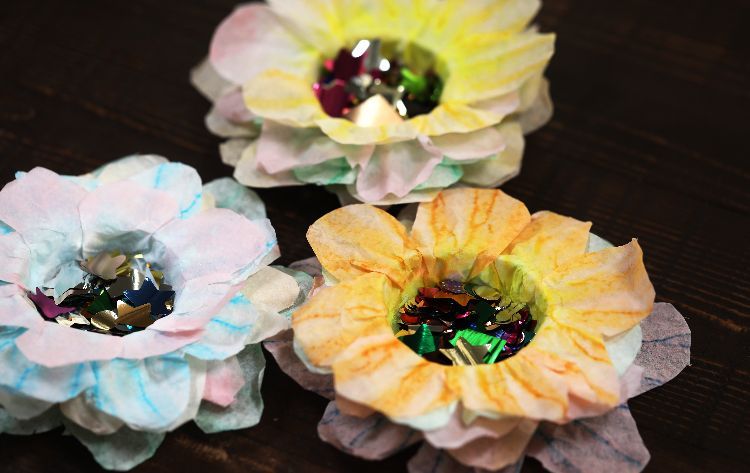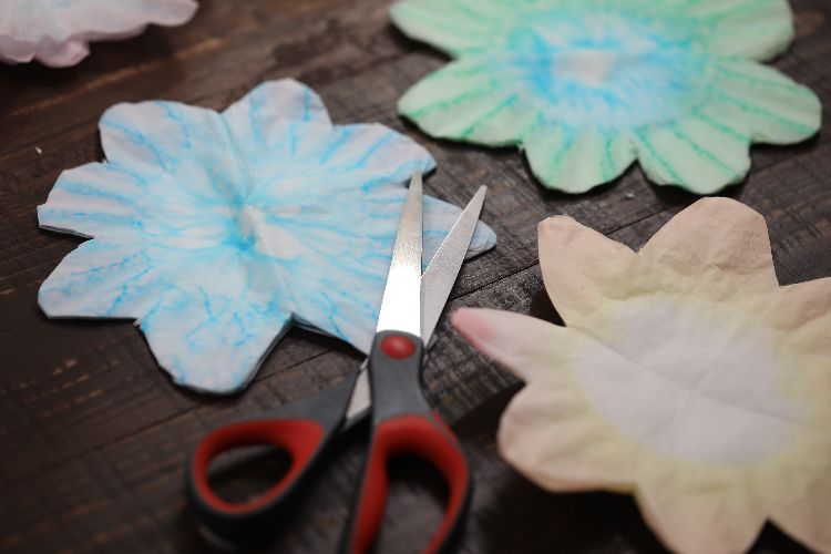 3. Set the coffee filters dry. The process of making the flowers appears quickly, with most of the time spent waiting for food coloring and water dipped coffee filters to dry.